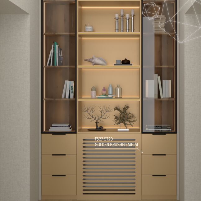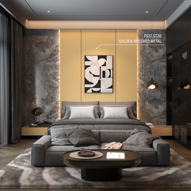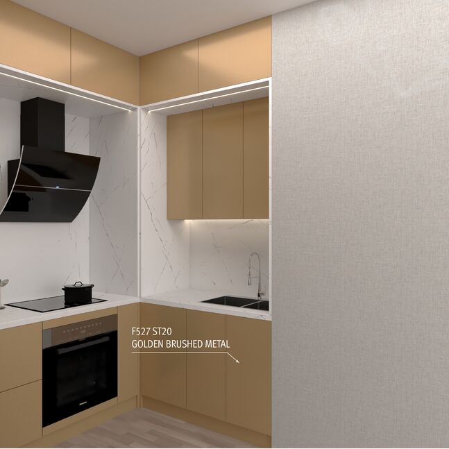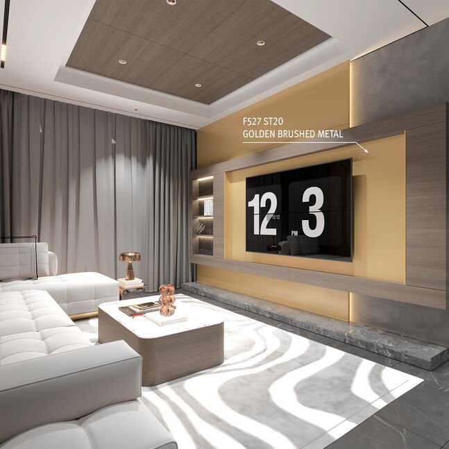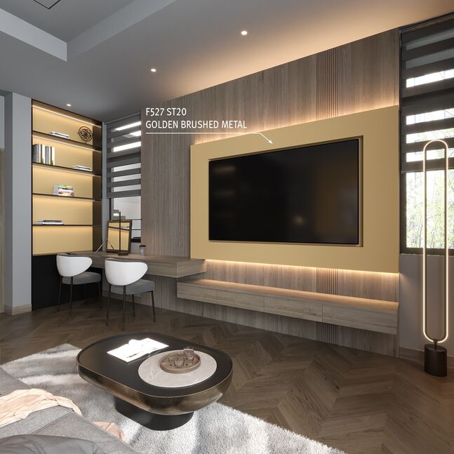 The mother-of-pearl decor F527 Golden Brushed Metal is the warm version of a sanded metal look. This is where luxury and technology come together. The golden colour tone is a good material contrast to dark, almost black wood. The linear sanding pattern of the ST20 Metal Brushed surface texture perfects the already optical reflective nature with a realistic feel.