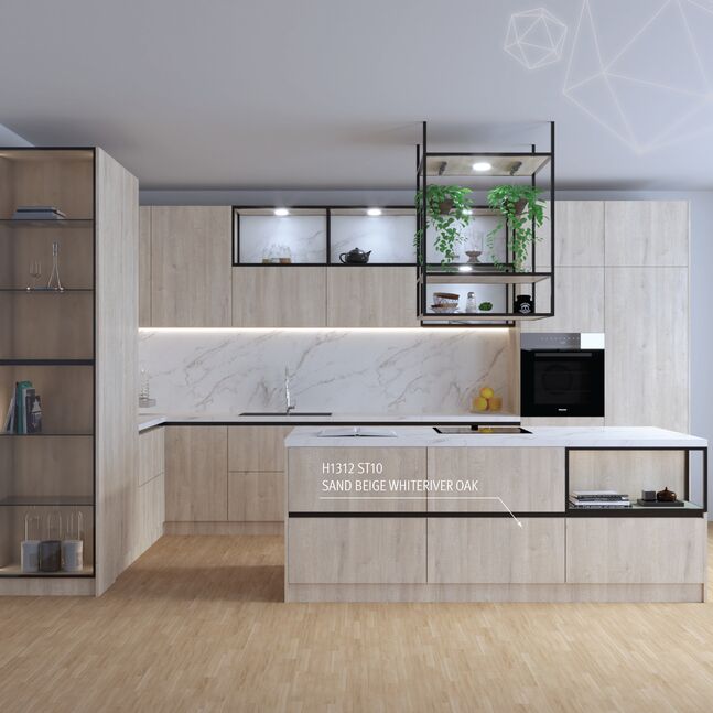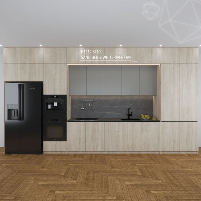 The H1312 Sand Beige Whiteriver Oak has a vintage character. With its white pore, combinations with white and light grey tones, as well as a wide range of accent colours are possible. The ST10 Deepskin Rough surface texture gives the decor a naturally rough feel. In the EGGER Interior Match, this decor matches the colour of EPL183 laminate flooring from the EGGER PRO Flooring Collection 2021+.