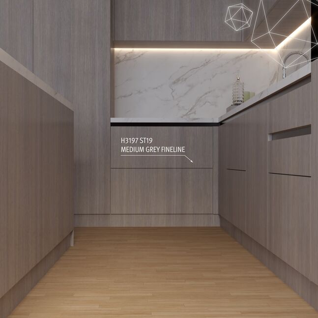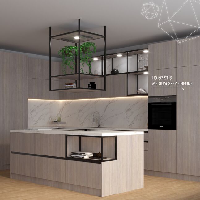 With Fineline decors, the colour is in the foreground. You can design surfaces with a material character, yet without appearing too dominant. The H3197 Medium Grey Fineline shows more naturalness and liveliness in the lines and is thus an update to its predecessors. The warm taupe colour tone is neutral and can be combined with many uni colours. The ST19 Deepskin Excellent surface texture gives the decor a typical wood feel.