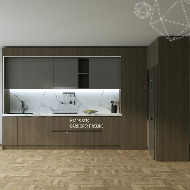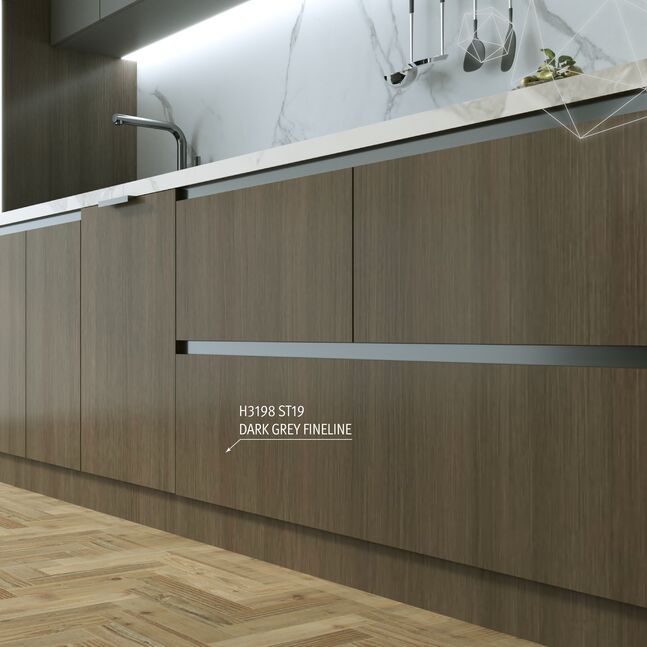 With Fineline decors, the colour is in the foreground. You can design surfaces with a material character, yet without appearing too dominant. The H3198 Dark Grey Fineline shows more naturalness and liveliness in the lines and is thus an update to its predecessors. The dark, warm colour tone is neutral and can be combined with many uni colours. The ST19 Deepskin Excellent surface texture gives the decor a typical wood feel.