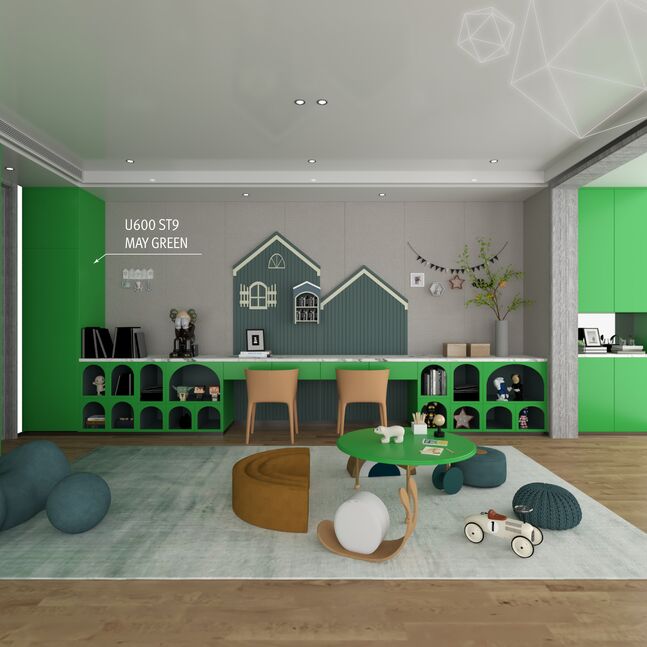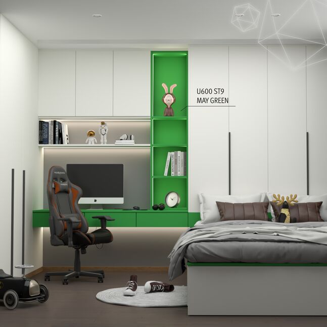 The saturated yellow-green U600 ST9 May Green looks as if it has been picked straight from nature, and thus looks good on authentic yellowish woodgrains. Gradations with other green nuances also enliven a room and fit in well with the current 'Biophilic Design'. The ST9 Smoothtouch Matt surface texture gives all uni colours a modern matt look and feel.