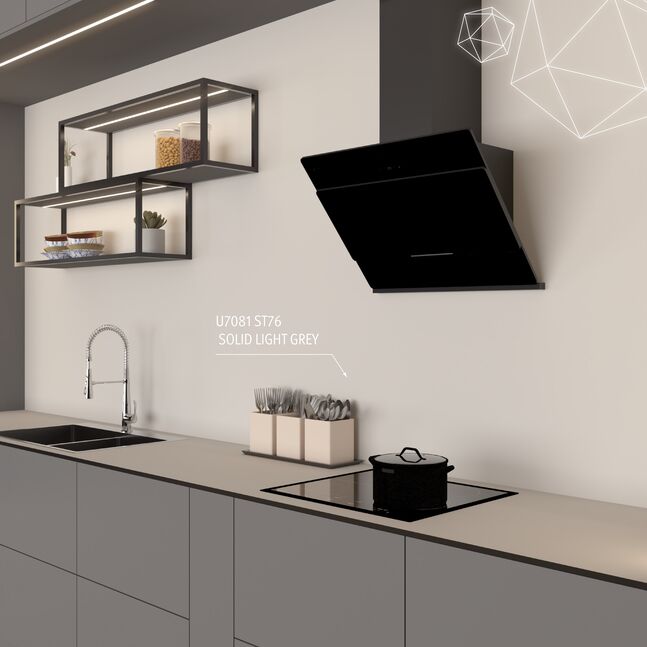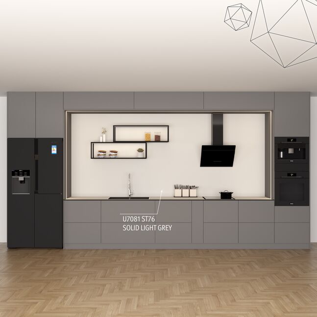 The U7081 Solid Light Grey is a dyed-through laminate on the ST76 Mineral Rough Matt surface texture similar to U708 Light Grey. In interior design, this grey decor is an all-rounder for neutral surfaces. With this laminate, furniture and interior design elements can be built with a seamless edge. It enables a high-quality finish and creates the effect of fully painted furniture elements. The combination with the rough yet elegant ST76 makes them look like real stone or ceramic elements.