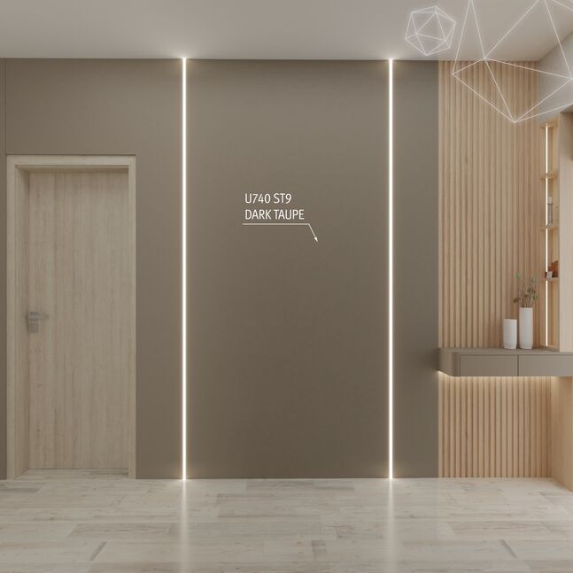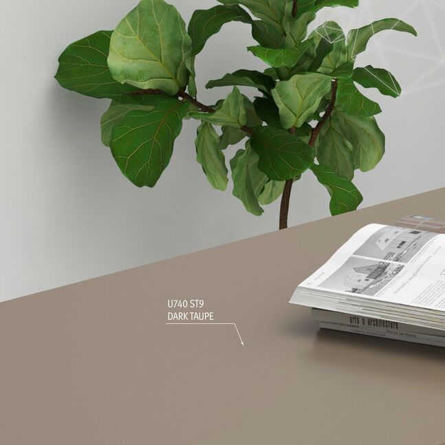 The U740 Dark Taupe is a colour tone from the family of timeless warm greys that is more technical, less reddish and therefore very adaptable. This makes the combination with black much more harmonious. The ST9 Smoothtouch Matt surface texture gives the decor a natural matt feel.