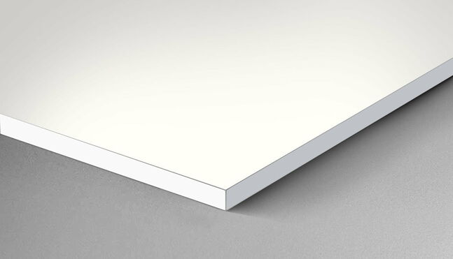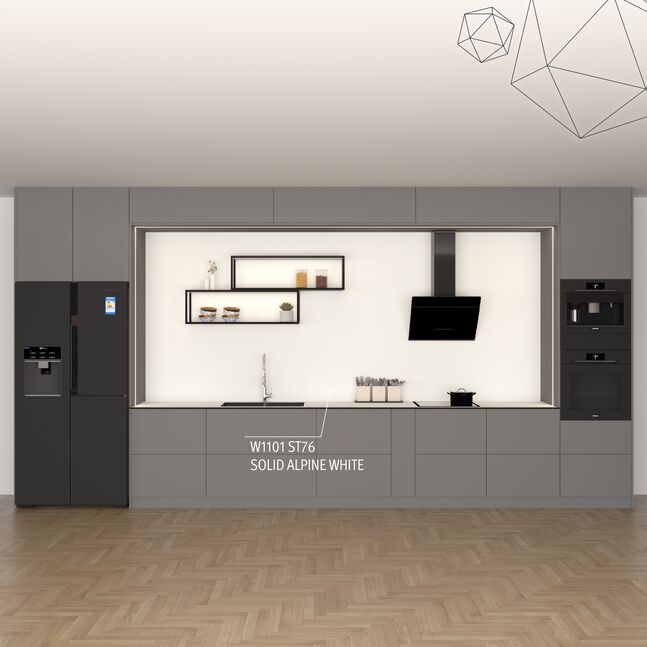 W1101 Solid Alpine White is a through-dyed laminate similar in colour to W1100 Alpine White with the rough matt stone surface ST76 Mineral Rough Matt. With this laminate, furniture and interior design elements can be built with a seamless edge. It enables a high-quality finish down to the last detail. This gives furniture elements the appearance of being painted over the entire surface and creates a rough stone feel.